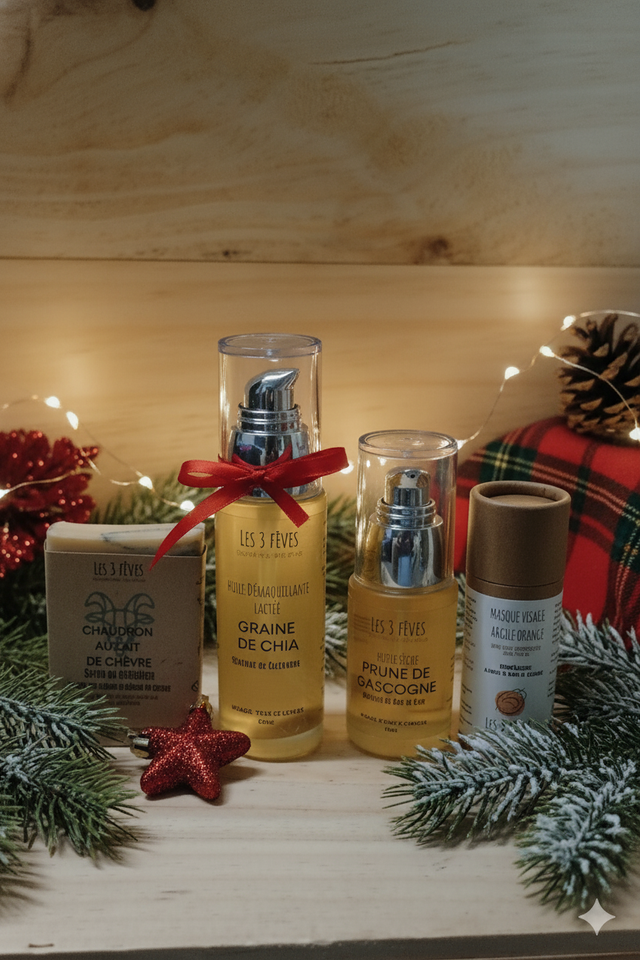 Ce coffret de cosmétiques est parfait pour prendre soin de son visage avec son masque solide reminéralisant et apaisant, son huile sèche visage et corps, son huile démaquillante lactée, le tout accompagné de son savon au lait de chèvre ou savon au Karité & aloé vera (Vegan)