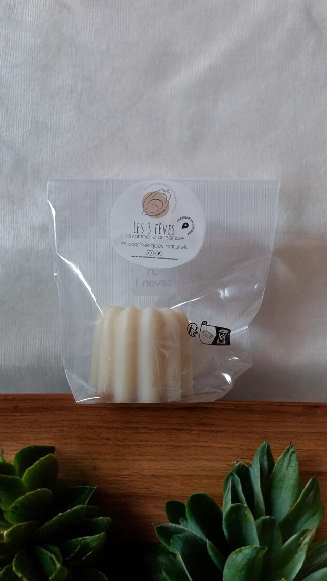 Savon en forme de cannelé surgras enrichi en lait d'amande, beurre de cacao et macérât huileux de vanille maison.
